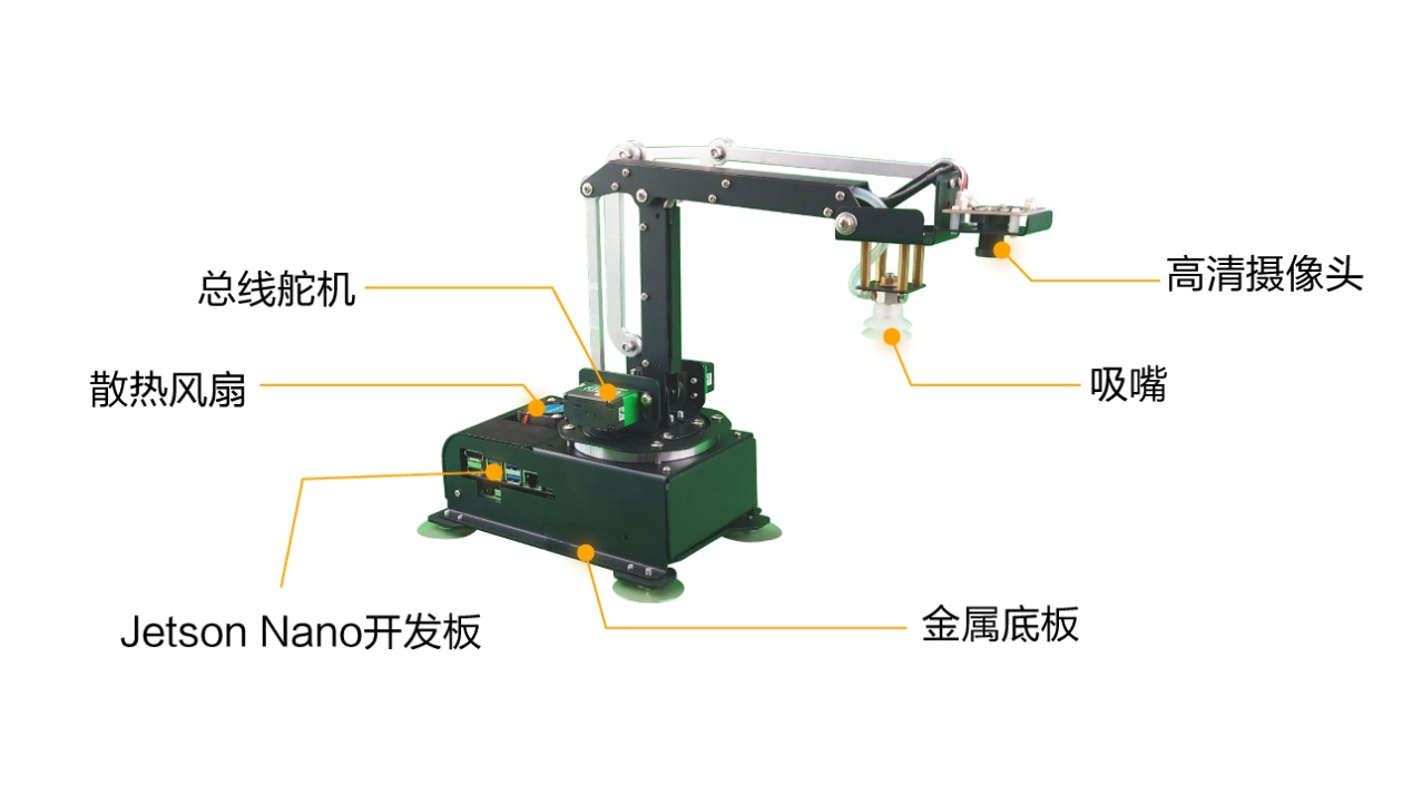 1. Jetson Nano 开发板:这款机械臂的核心控制板是 Jetson Nano 开发板,一款专为边缘人工智能计算而设计的强大硬件平台,为学生提供了极好的性能和稳定性。